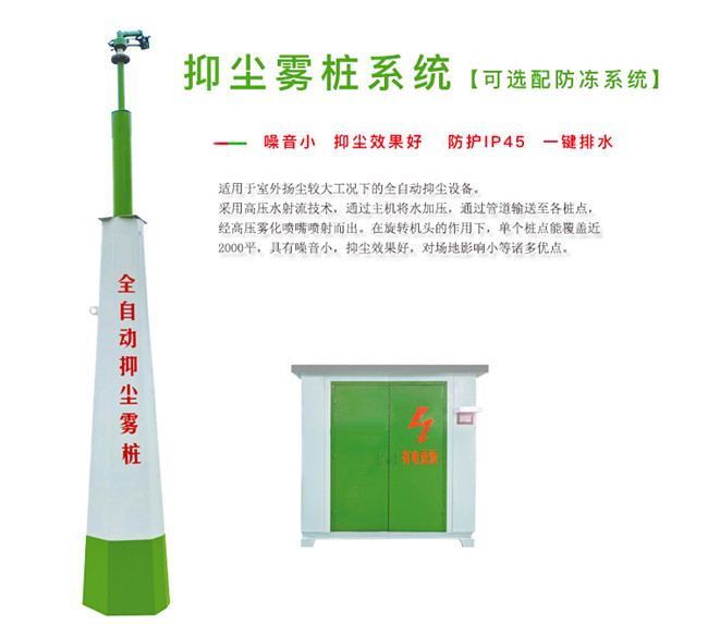 適用于室外揚塵較大工況下的全自動抑塵設備。 采用高壓水射流技術,通過主機將水加壓,通過管道輸送至各樁點, 經高壓霧化噴嘴噴射而出。在旋轉機頭的作用下,單個樁點能覆蓋近2000平,具有噪音小,抑塵效果好,對場地影響小等