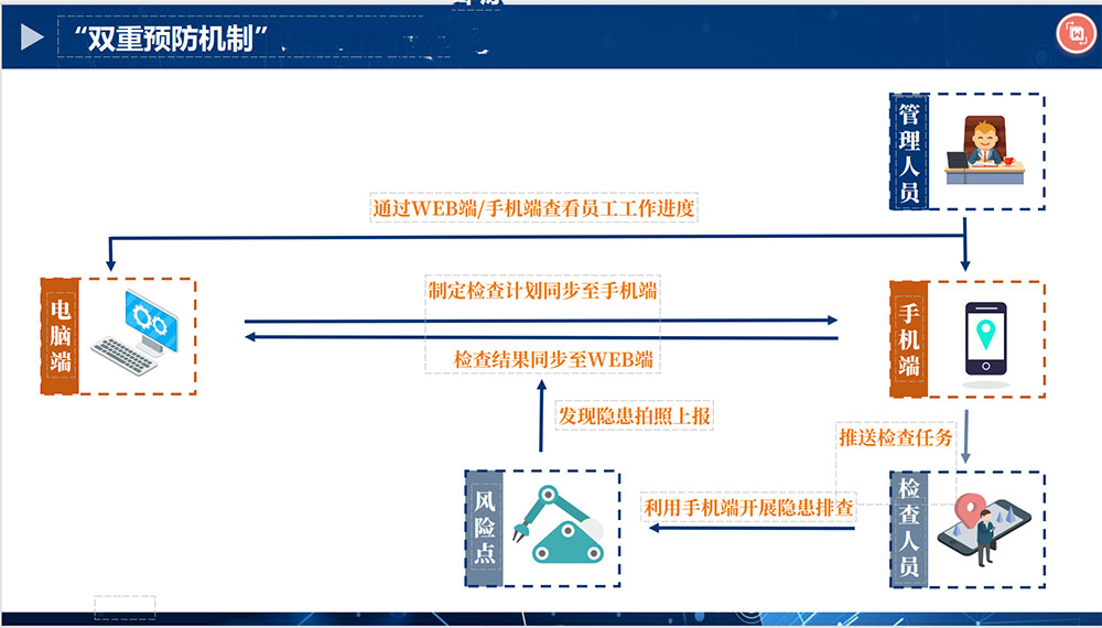 微安全系統(tǒng)“雙重預防機制” ,是根據(jù)相關政策要求,結合國際先進的安全管理理論方法和企業(yè)安全管理的水平,借助互聯(lián)網(wǎng)、移動通信、物聯(lián)網(wǎng)、云服務和大數(shù)據(jù)等技術,研發(fā)形成雙重預防機制信息化系統(tǒng),以系統(tǒng)化的安全咨詢方案為基礎,針對企業(yè)安全風險特點,與生產(chǎn)運營對接,動態(tài)管控安全風險和隱患排查治理,精準解決風險分級管控和隱患排查治理制度落地、安全生產(chǎn)風險實時監(jiān)控和科學化決策等難題,有效推進事故預防工作信息化、數(shù)字化、動態(tài)化,實現(xiàn)企業(yè)安全管理的革命性突破。